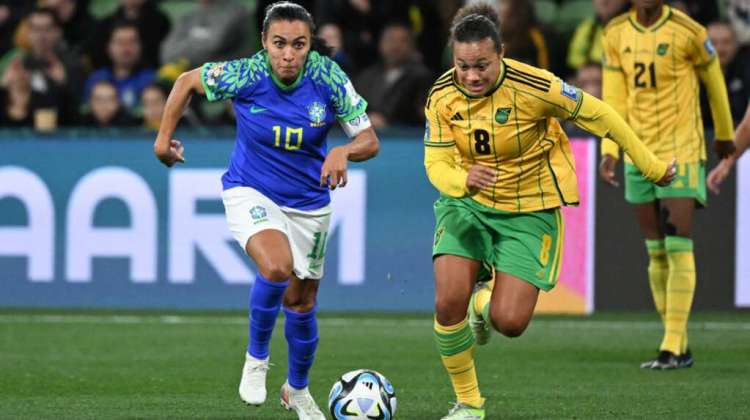 Brazil’s forward #10 Marta (L) fights for the ball with Jamaica’s midfielder #08 Drew Spence during the Australia and New Zealand 2023 Women’s World Cup Group F football match between Jamaica and Brazil at Melbourne Rectangular Stadium, also known as AAMI Park, in Melbourne on August 2, 2023.WILLIAM WEST / AFP