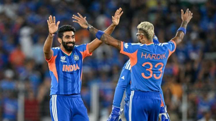 India’s Jasprit Bumrah (L) celebrates with Hardik Pandya after taking the wicket of New Zealand’s captain Mitchell Santner during the 2026 ICC Men’s T20 Cricket World Cup final match between India and New Zealand at the Narendra Modi Stadium in Ahmedabad on March 8, 2026. (Photo by Punit PARANJPE / AFP)