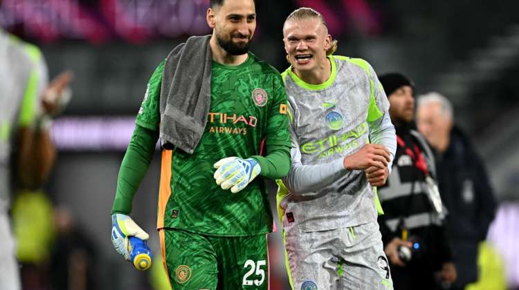 Manchester City’s Italian goalkeeper #25 Gianluigi Donnarumma celebrates with Manchester City’s Norwegian striker #09 Erling Haaland after the English Premier League football match between Burnley and Manchester City at Turf Moor in Burnley, north-west England on April 22, 2026. (Photo: AFP)