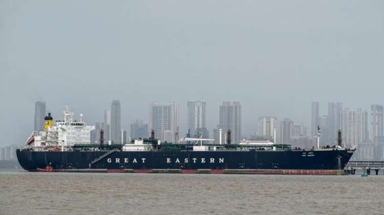 Jag Vasant, an Indian-flagged tanker carrying liquefied petroleum gas (LPG) that transited through the Strait of Hormuz amid the Middle East war, remains docked at an offloading terminal along the coast in Mumbai on April 1, 2026. (Photo by Punit PARANJPE / AFP)