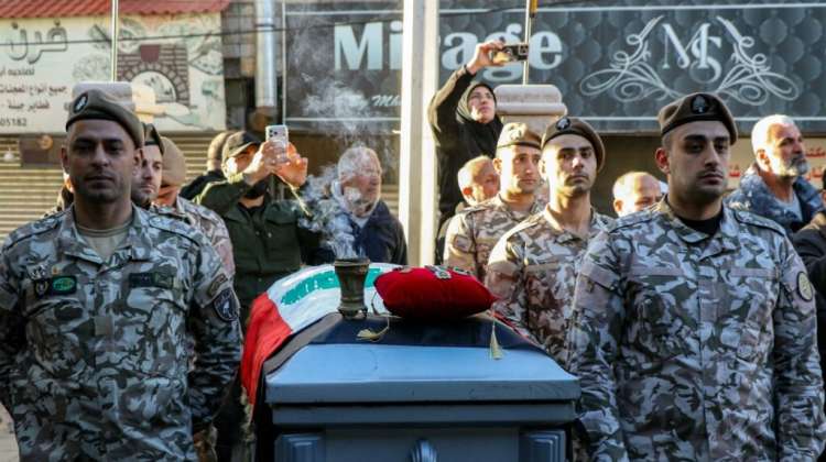 Members of Lebanon’s General Security forces stand with the casket of a fallen comrade, who was killed earlier in the week during an Israeli operation on the village of Nabi Sheet in the eastern Bekaa Valley, during the funeral in the village on March 8, 2026. The Israeli special forces operation that failed to find the remains of airman Ron Arad, captured in Lebanon in 1986, killed 41 people and wounded 40 in eastern Lebanon. Gutted buildings, torn-off roofs, munitions scattered on the ground surrounded a large crater in the town that witnessed the operation which involved air strikes and clashes. (Photo by Nidal SOLH / AFP)